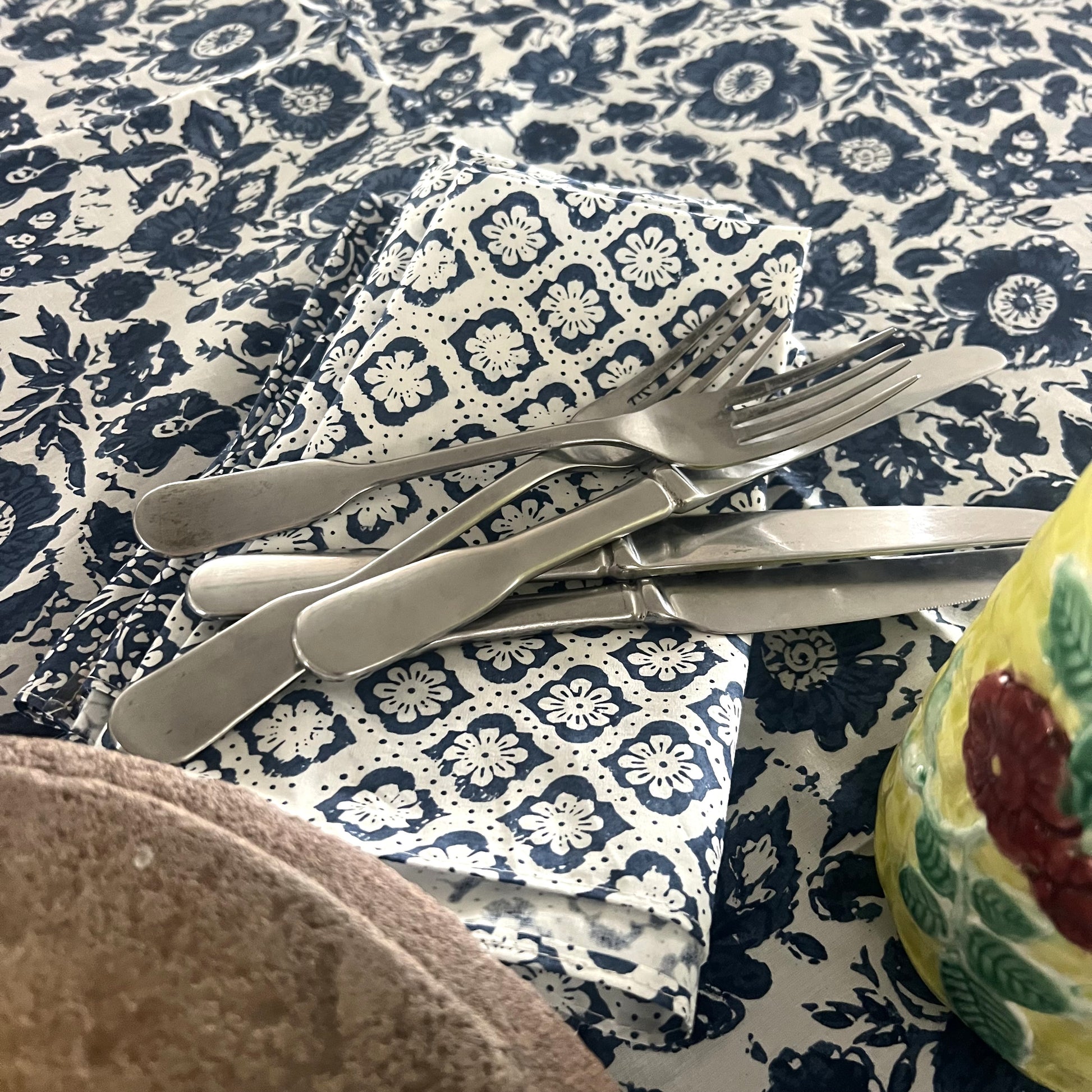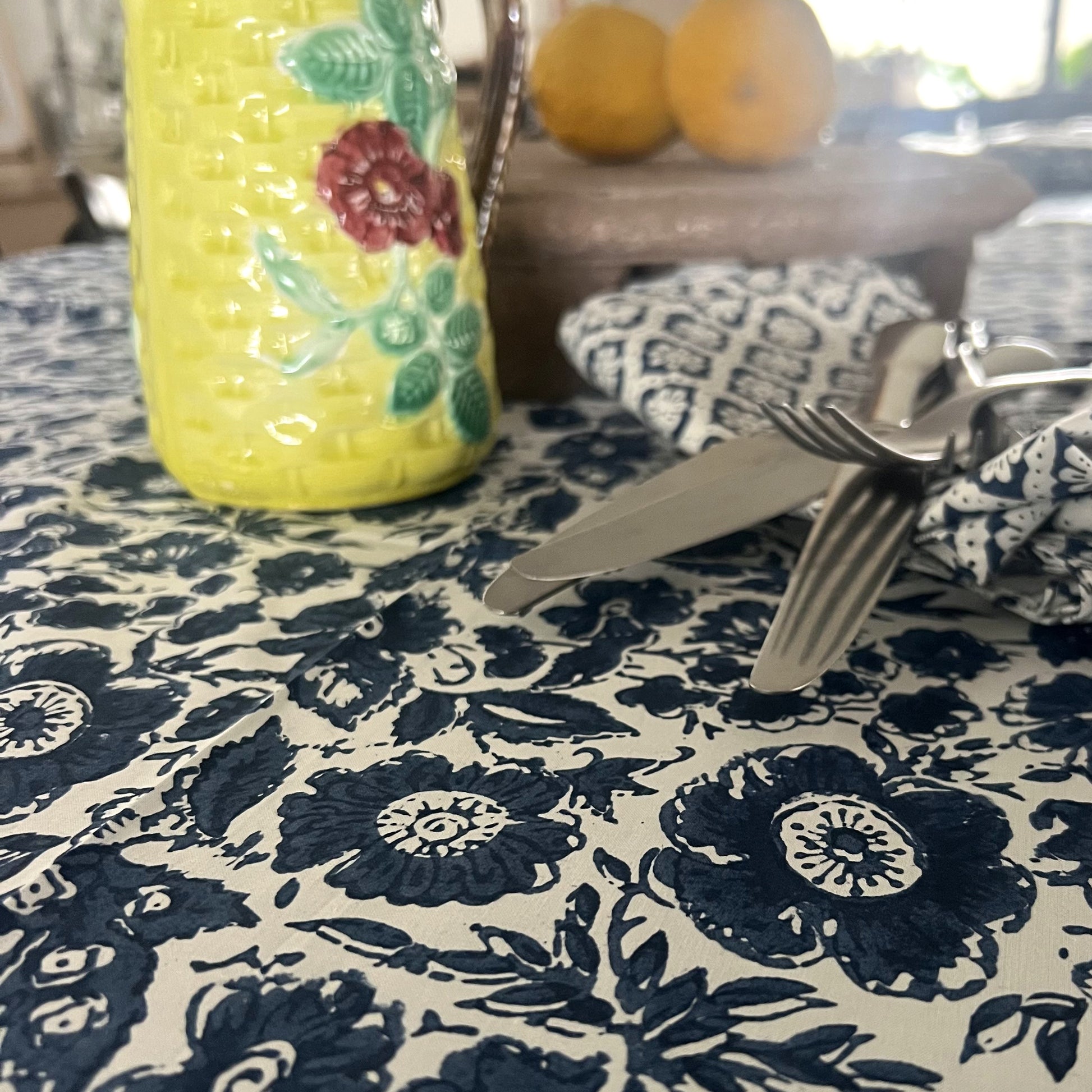 vintage floral block print cotton tablecloth blue and white